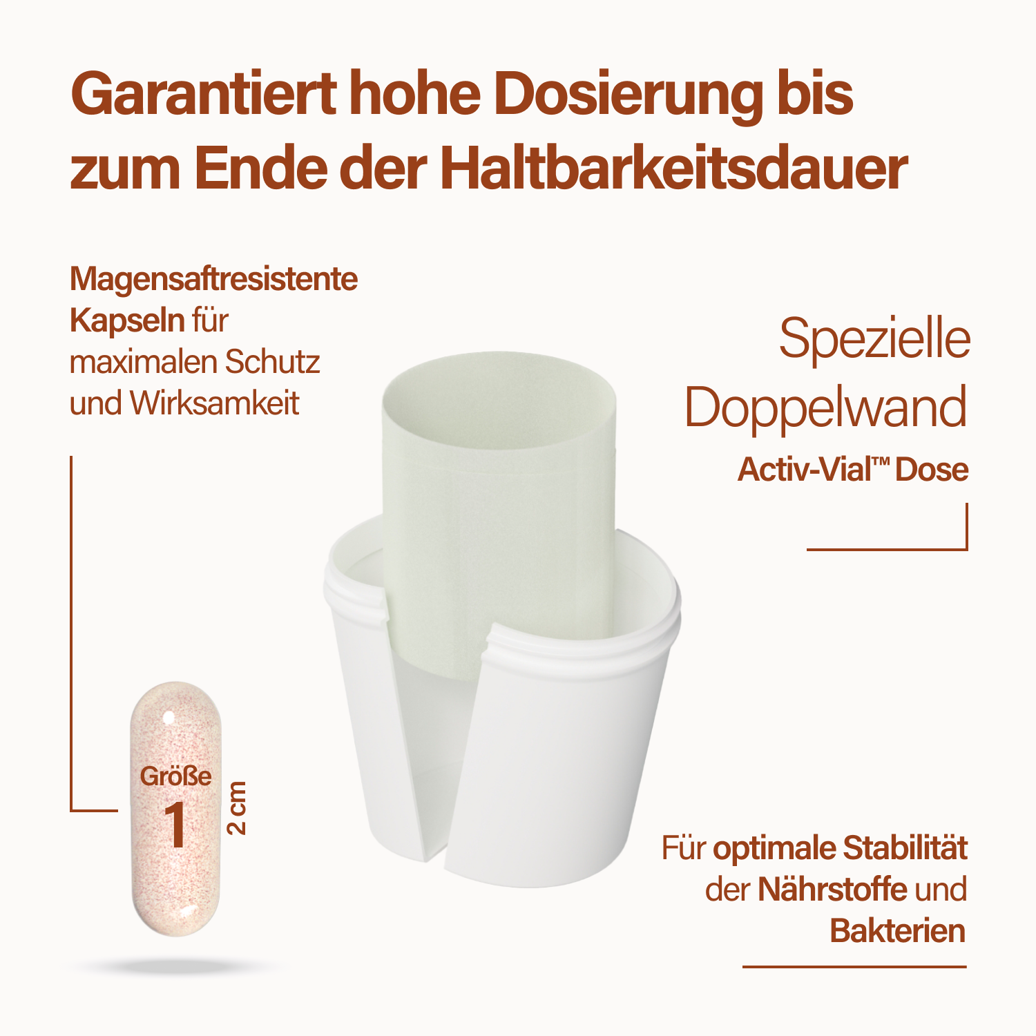 Um die hohe Wirksamkeit unserer bioaktiven Inhaltsstoffe zu gewährleisten, verwenden wir spezielle Activ-Vial™-Dosen, die mit einem aktiven Polymer ausgekleidet sind, das effektiv Feuchtigkeit absorbiert und die Stabilität der Inhaltsstoffe bewahrt.