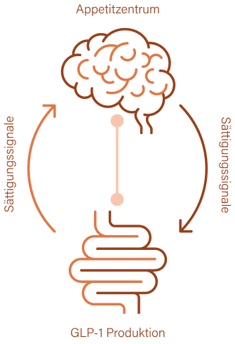 - 1Wenn Sie essen, werden die Stoffwechselprozesse in Ihrem Körper über die Verbindung zwischen Darm und Gehirn in Gang gesetzt. Das Vorhandensein von Nährstoffen im Verdauungstrakt löst die Freisetzung des Hormons GLP-1 aus, das auch als Sättigungshormon bekannt ist.