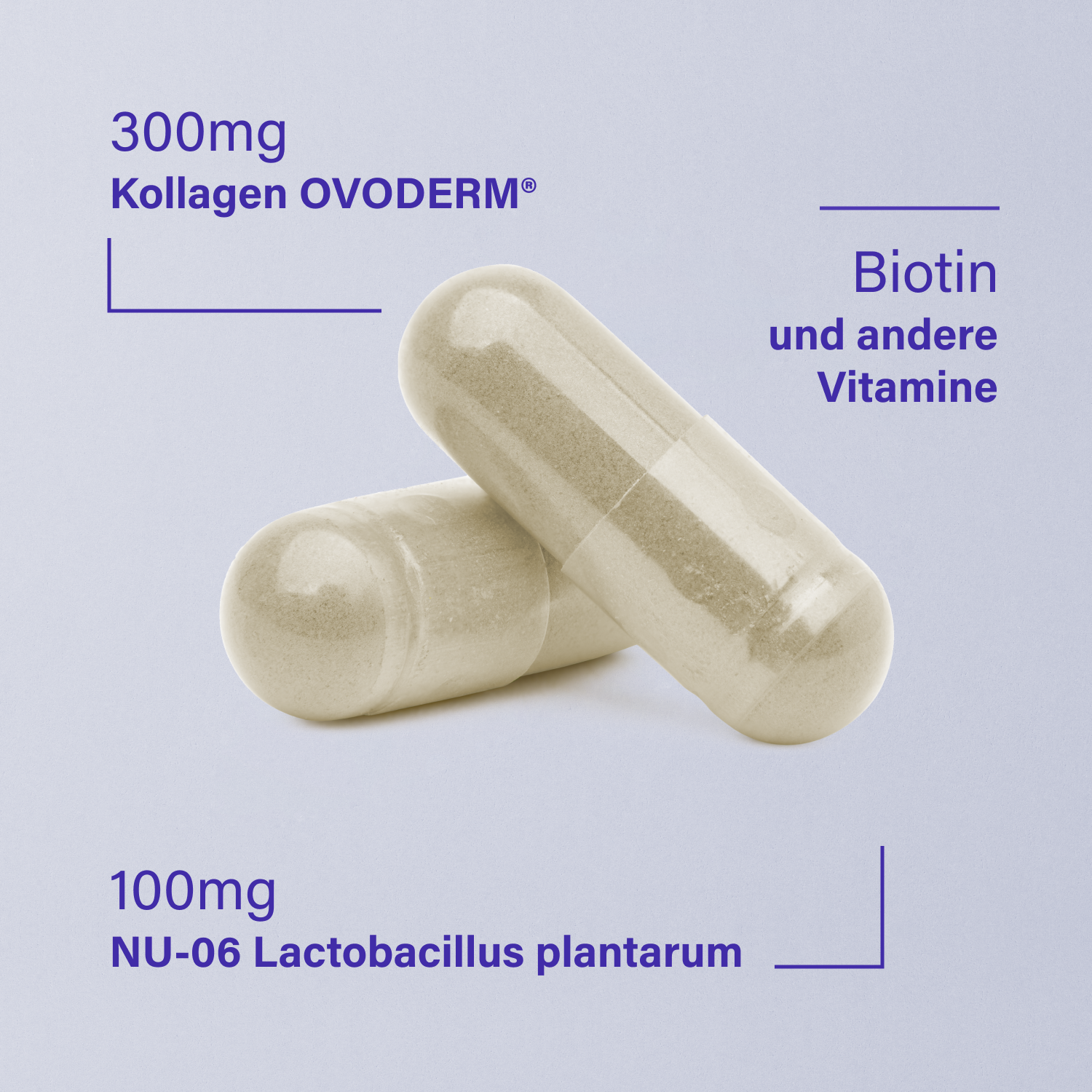 Innovative 14-in-1-Formel mit Ovoderm-Kollagen, unterstützt durch einen patentierten Bakterienstamm und wichtige Nährstoffe wie Vitamin A, Biotin, Kupfer und Mangan für eine gesunde Haut.
