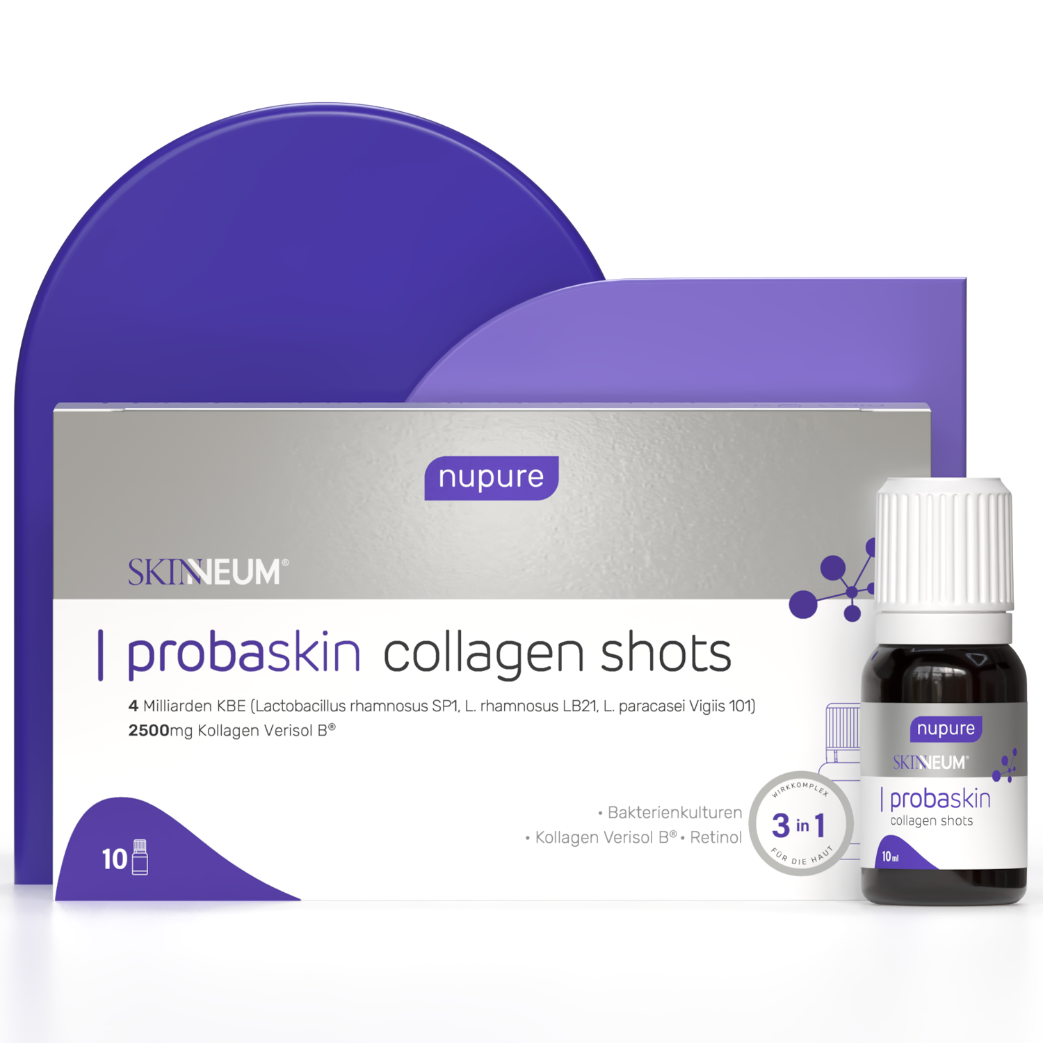 Kollagen ist einer der Hauptbestandteile der Haut. Mit zunehmendem Alter nimmt die Kollagenproduktion des Körpers ab, und infolgedessen sinkt auch der Kollagengehalt in der Haut. Es entstehen Falten und Furchen, und die Haut verliert an Elastizität. Nupure probaskin collagen shots versorgen den Körper mit Kollagen. Die speziellen Kollagenpeptide Verisol B überstehen den Verdauungsprozess teilweise unbeschadet und stehen dem Körper dann direkt zur Verfügung – im Gegensatz zu vielen anderen Kollagenpeptiden, die erst „wieder zusammengesetzt“ werden müssen.